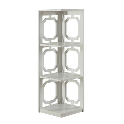 Add a touch of functional style and additional decor-displaying space to any room in your home with this Omega 3-Tier Corner Bookcase from Convenience Concepts. This wood corner shelf features a unique geometric cut-out design on both sides, allowing the color of your walls to be seen to create an open, airy feel. It has four shelves, including the flat top, that are perfect for displaying decorative items like picture frames, books or even small potted plants. With a compact design that’s great for smaller spaces and utilizing every corner of a room, you can use this corner shelf with cut-out sides in a living room, den space, home office or even in an entryway.