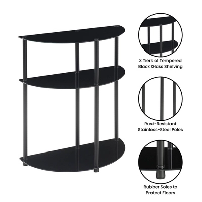 Modernize your entryway with the Designs2Go Classic Glass 3 Tier Half-Circle Entryway Hall Table by Breighton Home. This classic and elegant design is the perfect unit to place in the hallway, entryway, foyer, living room, and more. Plenty of surface space is available thanks to 3 tiers of shelving to display beautiful decorative home pieces. Each shelf is made of black tempered glass and the screw-in poles are made of sturdy rust-resistant stainless steel making this modern piece practically maintenance-free. In addition, rubber soles cover the bottom of each pole to help protect your floors. This luxurious hall table can easily be assembled in minutes and requires no tools to put it together. Complete your luxurious home look with additional black glass pieces from the Designs2Go Classic Glass Collection by Breighton Home, each sold separately.