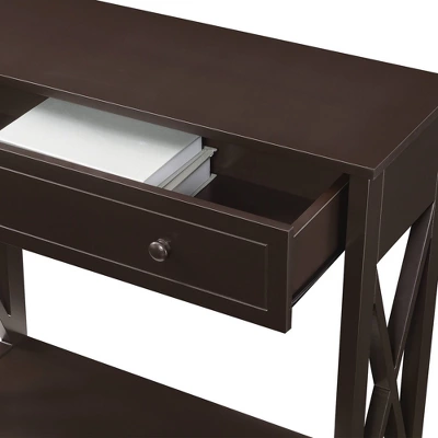 Make your home truly timeless with the Oxford 1 Drawer Entryway Hall Table with Shelf by Breighton Home. This transitional hallway table features a pull-out drawer on smooth roller slides with two minimal drawer knobs for easy accessibility. The wide drawer gives plenty of room to stow away entryway essentials such as car keys, mail, and more. Unique side X-panels mesh with many interior styles such as farmhouse, industrial, and even coastal. A spacious tabletop and additional bottom shelf are perfect for display of decorative home favorites. Carefully crafted with manufactured wood and finished with smooth non-lead-based paint, this stylish unit is sure to last. Pair with additional coordinating pieces from the Oxford Collection by Breighton Home, each sold separately.